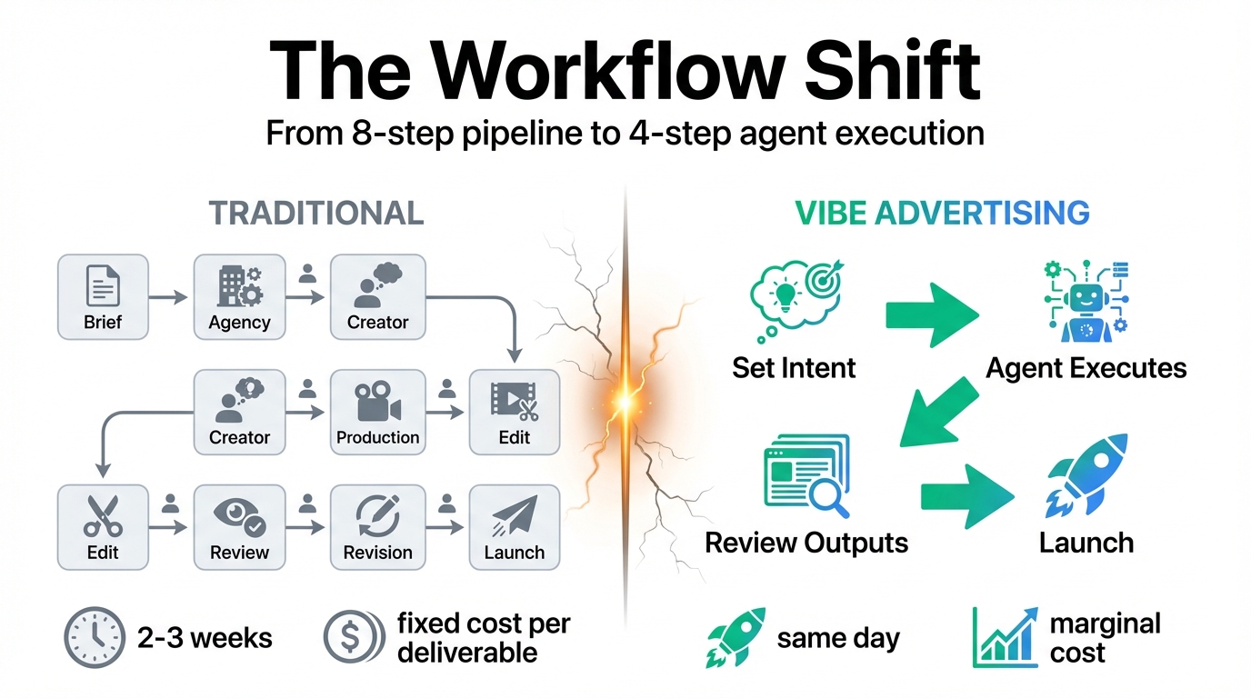 They didn't write 47 scripts. They didn't brief 47 creators. They set an intent, described a product, pointed at a target customer, and let an agent handle everything downstream.