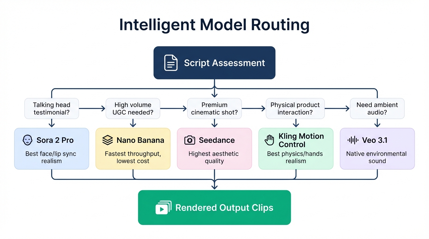 The routing logic isn't manual. The agent assesses each script, identifies the shot requirements, and matches it to the model with the strongest output for that specific use case.