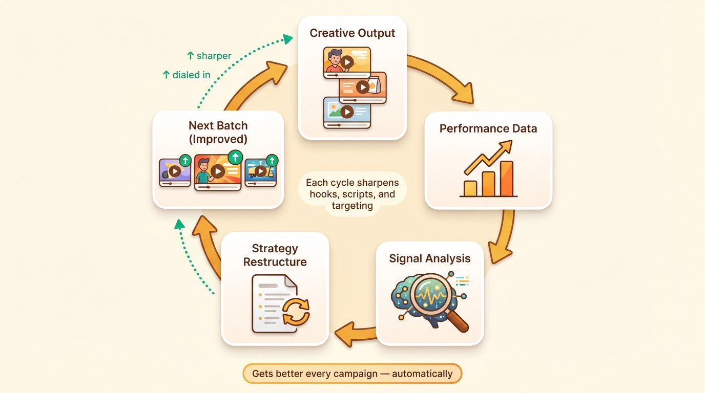 Over multiple campaigns, the agent builds a working model of what converts for that product and customer. Creative output gets tighter each time. Hooks get sharper. Scripts get more dialed in.
