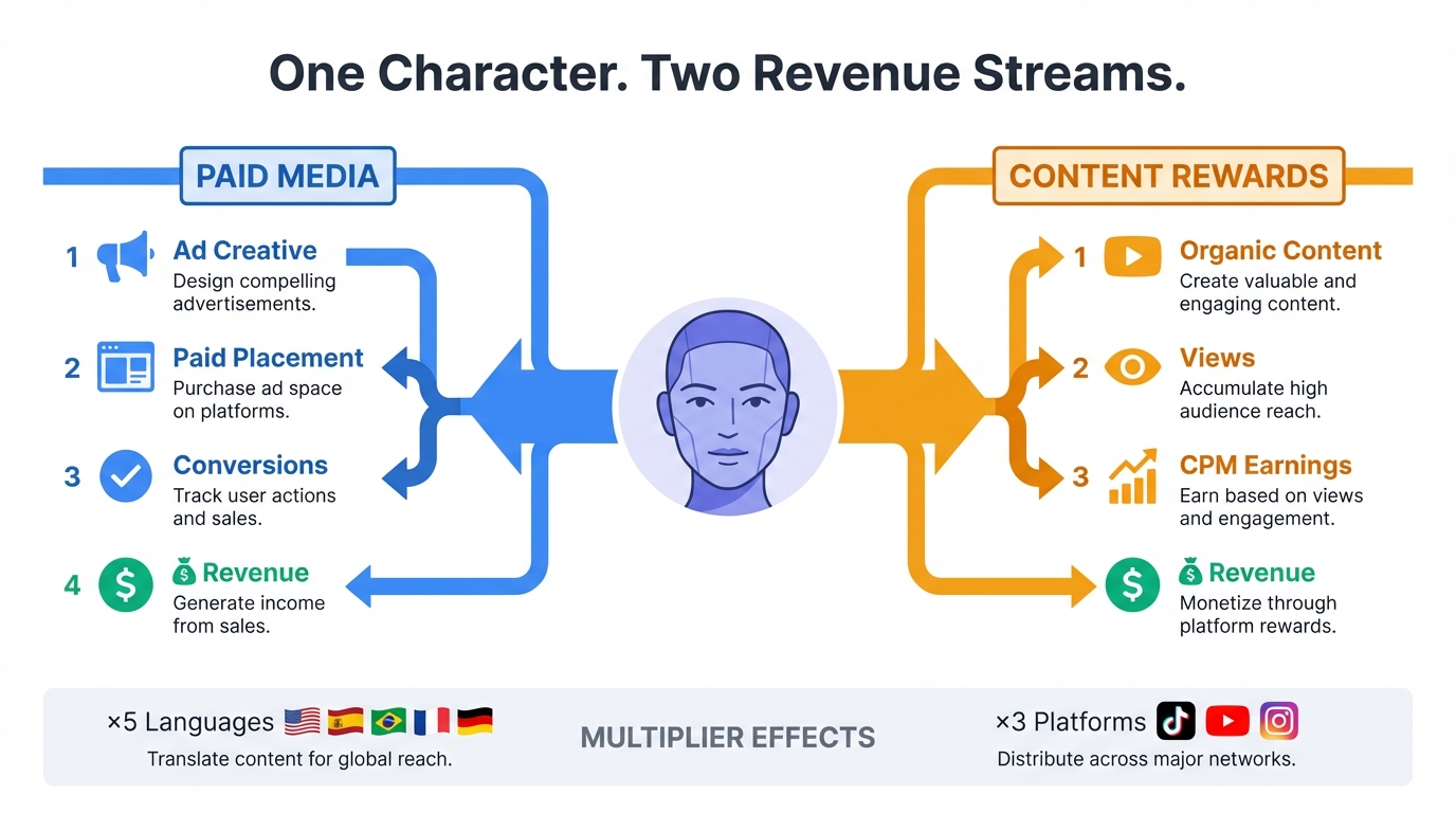 Add Content Rewards on the organic side and you have two monetization channels running off one character and one pipeline.