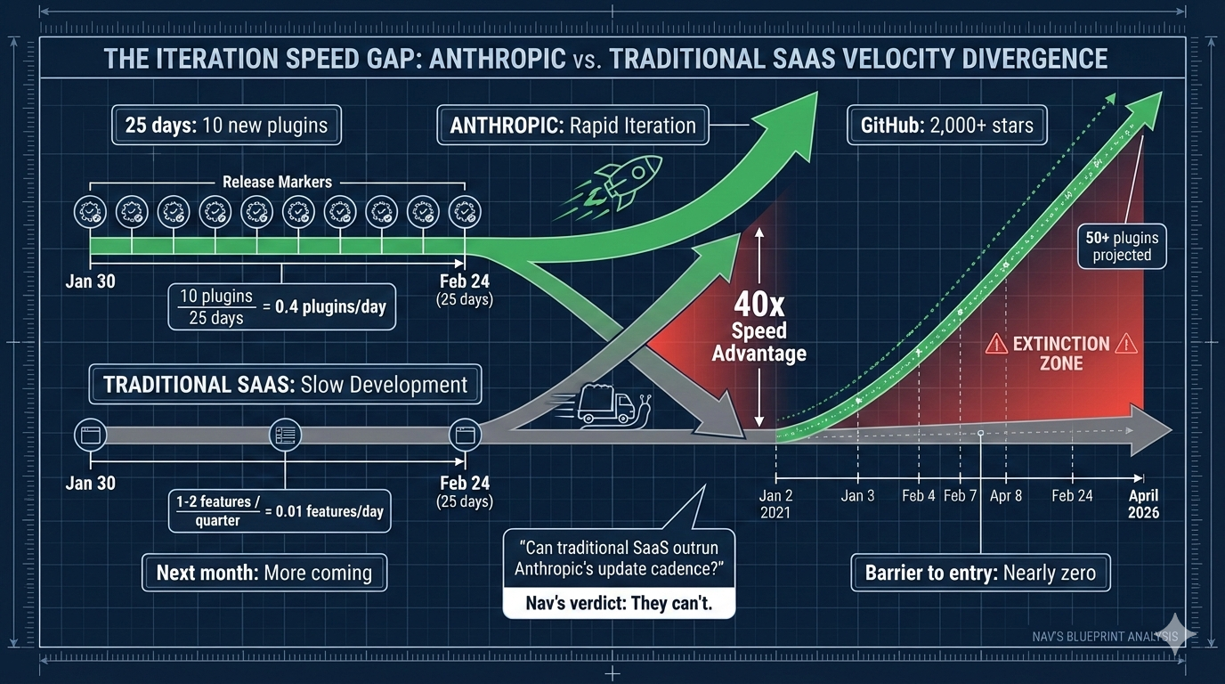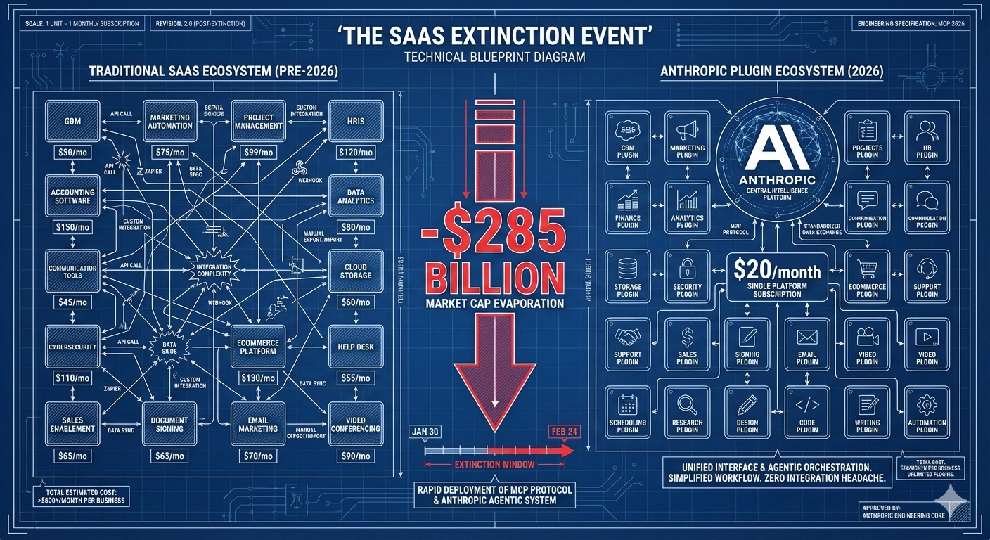 On January 30, Anthropic launched 11 plugins. On February 24, they added 10 more. In 25 days, the SaaS sector evaporated $285 billion in market value.