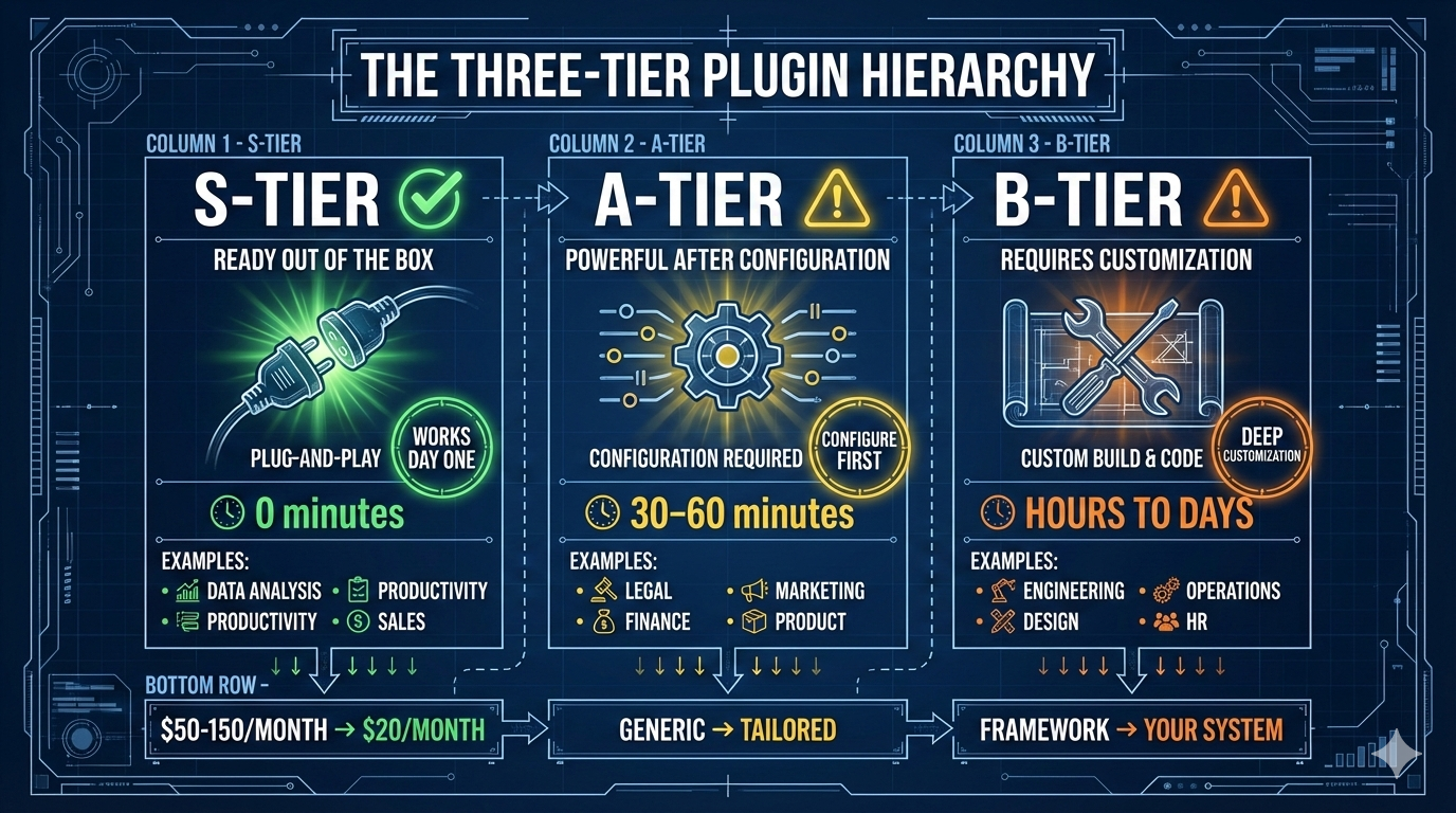 S-tier plugins work now. A-tier plugins work after configuration. B-tier plugins are frameworks waiting for you to fill in your company information. The real concern isn't whether any plugin is good—it's the iteration speed. 10 new plugins in 25 days. More coming next month.