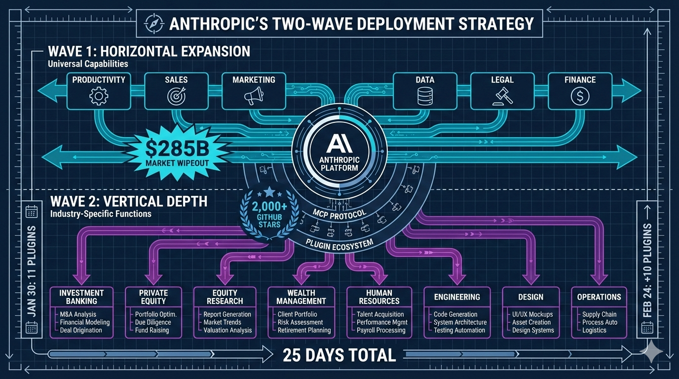 Wave 2 (February 24) went vertical: investment banking, private equity, equity research, wealth management, HR, engineering, design, operations—industry-specific, role-specific functions. This deployment strategy reveals Anthropic isn't building products—they're building a platform.
